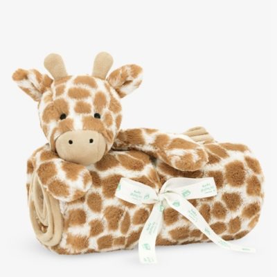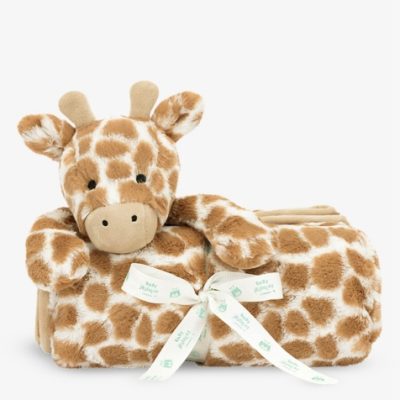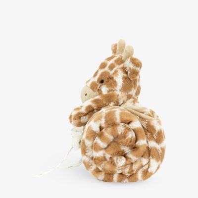 Product name is Bashful Giraffe faux-fur blanket 70cm