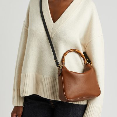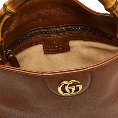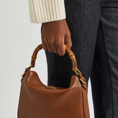 The Diana bag from Gucci is suspended from a bamboo top handle that lends it a rustic feel. Adored by and named after the Princess of Wales in the 90s, this modern take on a classic is crafted from leather to a small, slouchy silhouette and is accented with the iconic GG logo plaque.Â