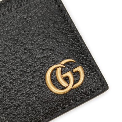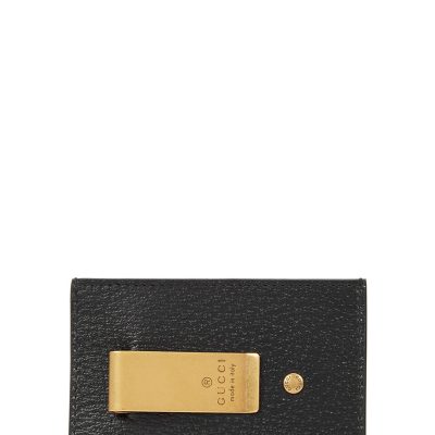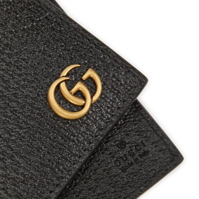 Gucci black grained leather card holder GG designer plaque three card slots slip pocket money clip at back burshed antique gold-tone hardware Presented in a designer-stamped box with a dust bag