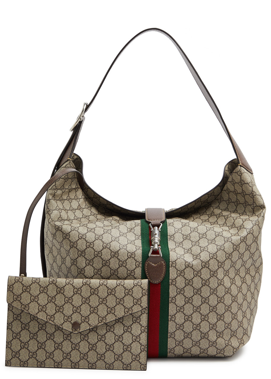 Gucci often recreates archival styles like the Jackie 1961 bag. Suspended from an adjustable shoulder strap, it’s crafted from GG Supreme coated canvas and is detailed with the house’s signature striped webbing and buckled hardware. It also houses a detachable pouch too.