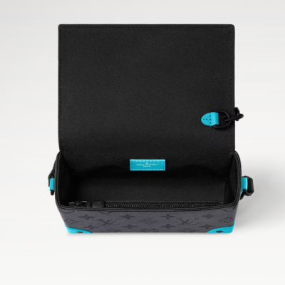 The Steamer Wearable Wallet takes on a summery feel in Monogram Eclipse Reverse canvas with a coloured cowhide leather trim. The adjustable strap and reinforced corners are in a vivid turquoise blue, bringing a jolt of colour to the monochromatic canvas. The hardware, including the signature pin-and-chain closure and the rivets on the reinforced corners, is black.